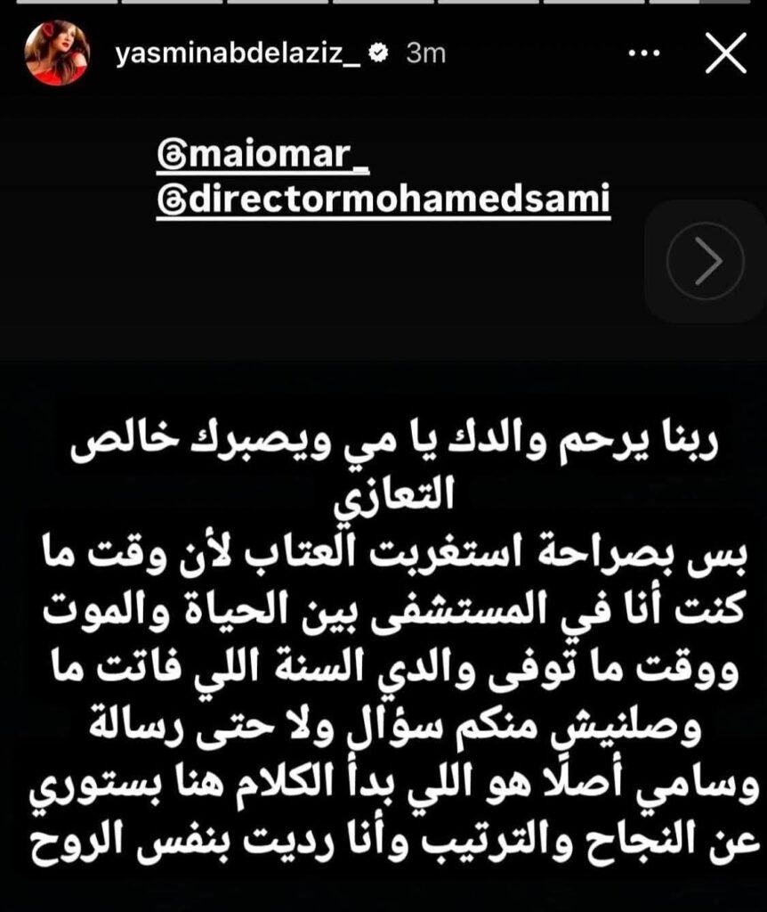 “ربنا يرحم والدك يا مي ويصبرك… بس بصراحة استغربت العتاب، لأن وقت ما كنت في المستشفى بين الحياة والموت ووقت وفاة والدي السنة اللي فاتت ما وصلنيش منكم سؤال ولا حتى رسالة”.
